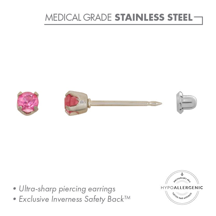 These earrings feature delicate 3mm round rose crystals in a four claw setting, and are crafted from stainless steel. Part of our ear piercing range- made specifically for new piercings only.