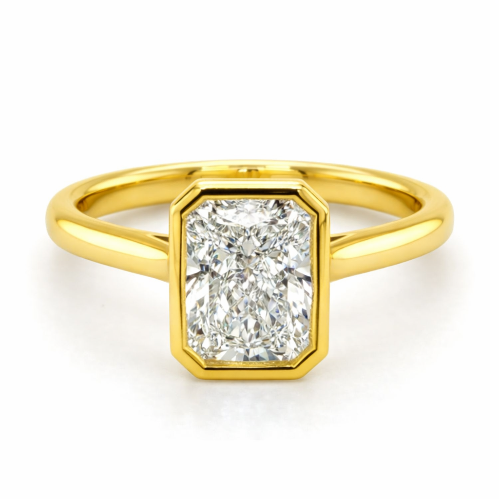 18ct Yellow Gold Lab Grown 1.50ct Radiant Cut Bezel Set Diamond Ring M