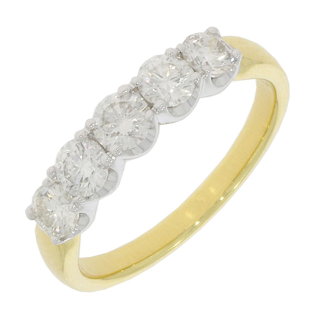 Crafted in 9ct yellow gold, this 5 stone eternity ring features claw set diamonds totalling 1.00ct on a plain polished band. Ring Size: N.