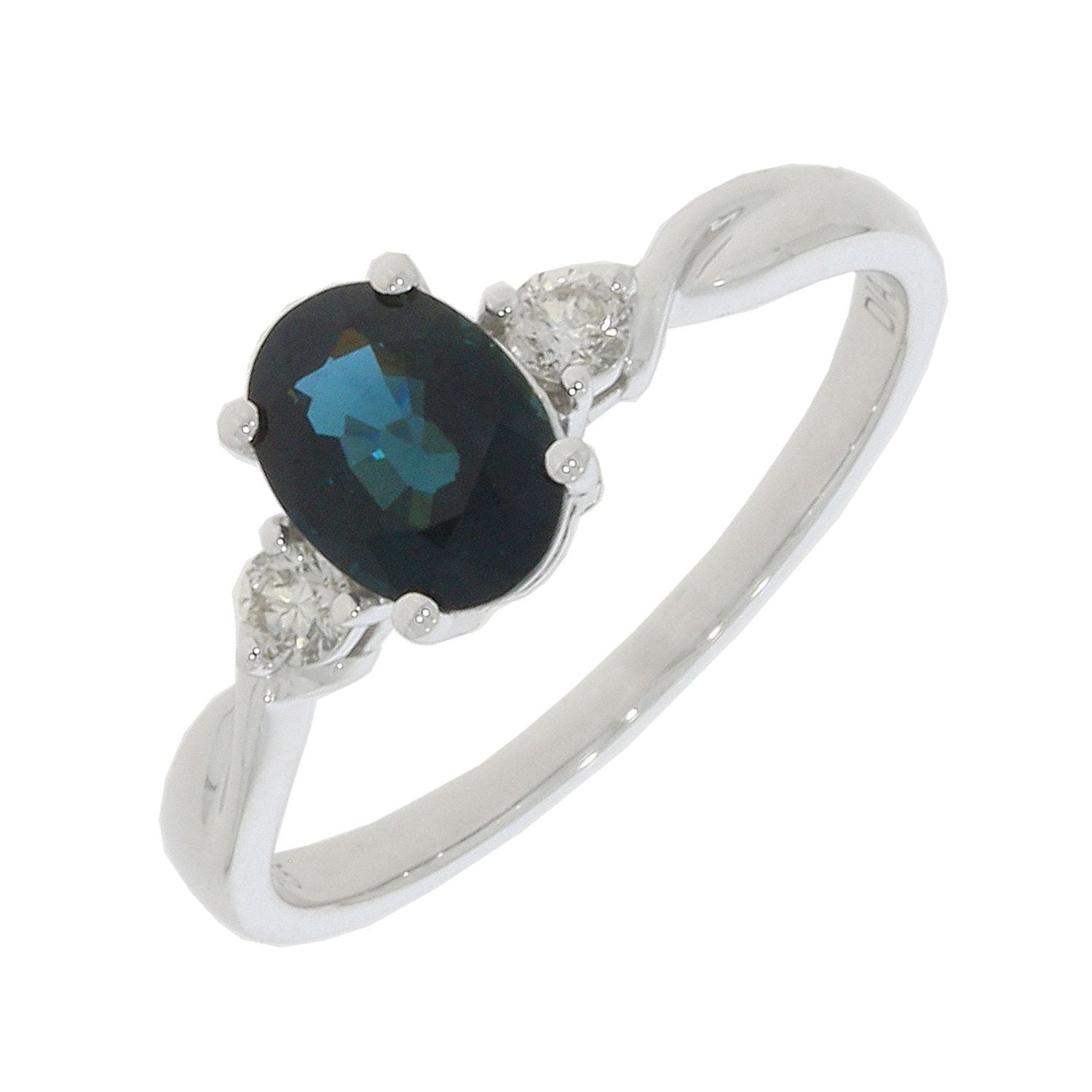 A 9ct white gold ring with a dazzling 1.05ct oval cut sapphire held in four claws, with round brilliant diamonds on either shoulder which total 0.10ct. The slight twist design to the band makes this ring a truly unique piece.