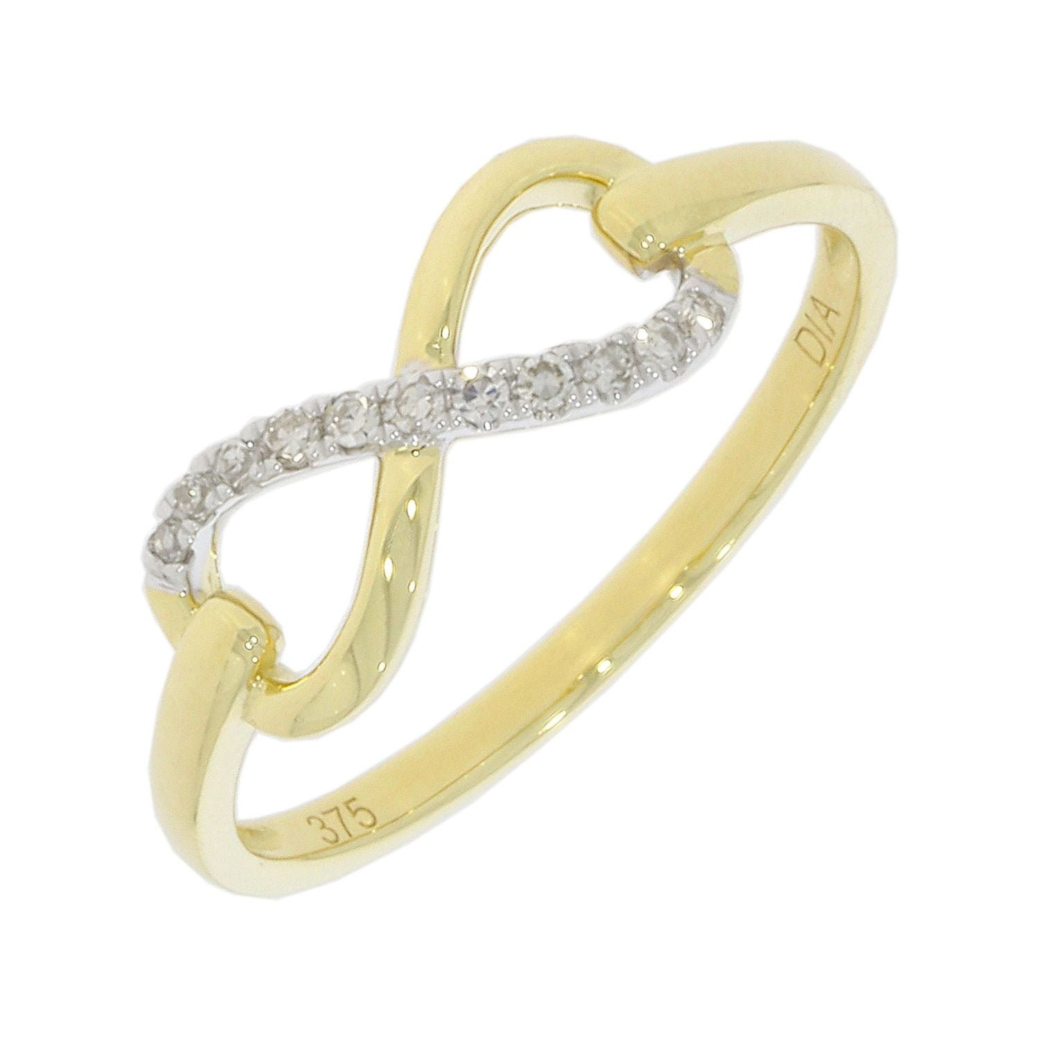 A 9ct yellow gold polished ring with an infinity symbol inlaid with 0.06ct round brilliant cut diamonds.