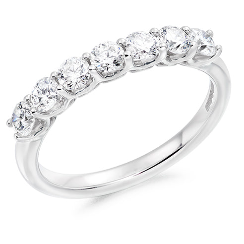 A stunning 7 stone diamond ring with so much sparkle. Seven round brilliant cut diamonds, 0.75ct, are claw set in platinum, on a platinum band. Ring size: M.