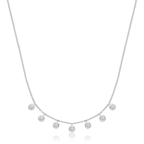 This sterling silver necklace has seven bezel set cubic zirconia stones spaced along a trace chain.