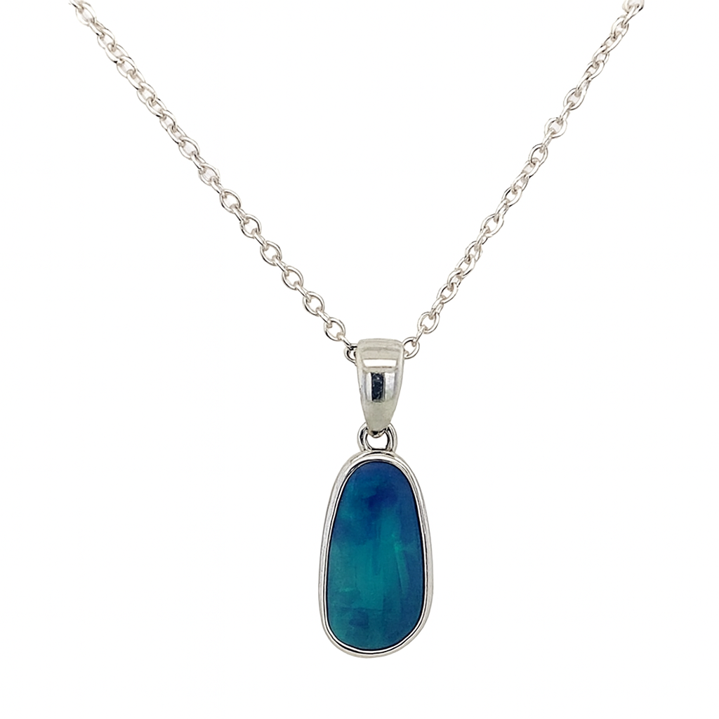 This sterling silver pendant necklace is formed with a natural opal, in a rubover setting.