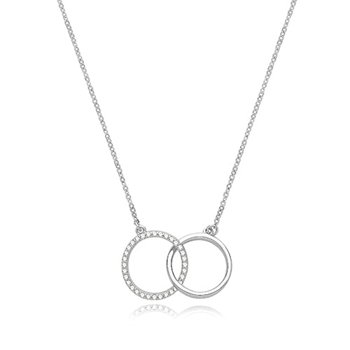 This necklace is crafted from sterling silver and has two interlocked circle pendants, one of which is inlaid with cubic zirconia stones.