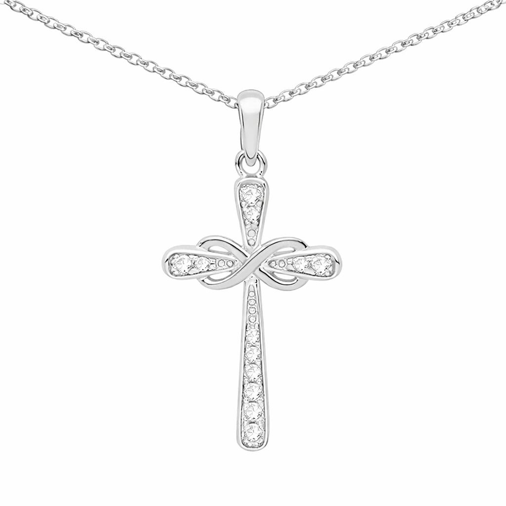 This polished silver cross pendant features 12 claw set cubic zirconia with a central infinity motif.