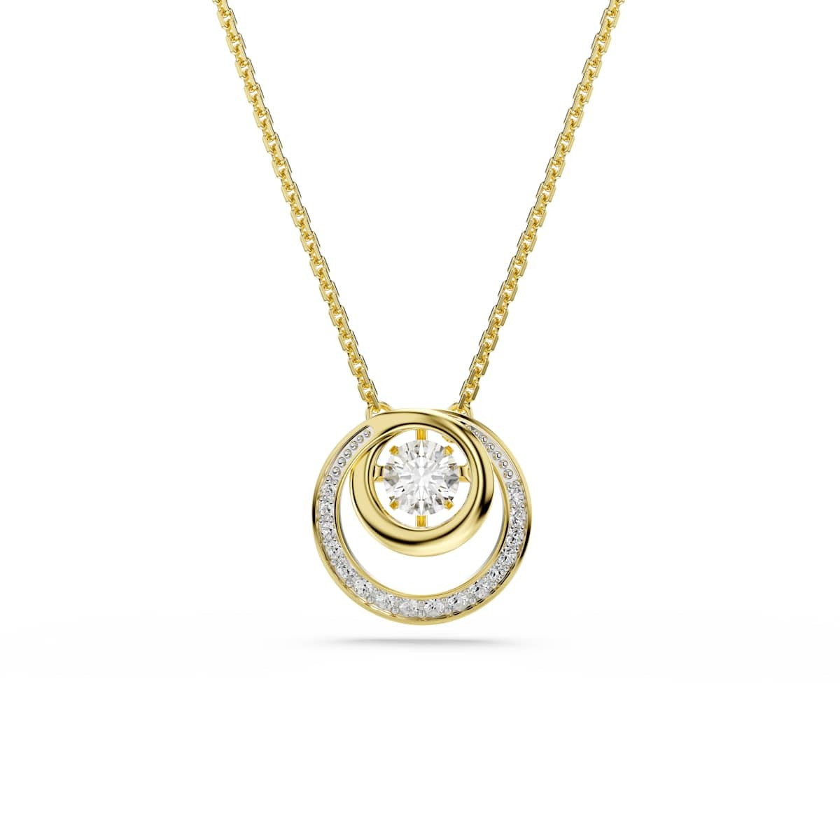 Blurring the line between classic and contemporary styles, this Hyperbola necklace delivers a unique jewelry silhouette. The circular design is gold-tone plated and features a central dancing stone surrounded by a frame of crystals in varying sizes. Wear it with matching earrings or a ring to emphasize the hypnotic look.