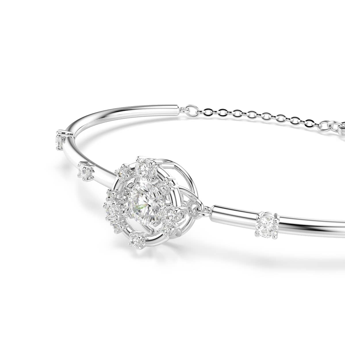 Taking inspiration from the stars, this Constella bracelet is crafted to shine bright. The rhodium plated design features a dancing stone at the center, which produces endless reflections, while smaller Swarovski Zirconia are positioned around the metallic frame and bangle. Wear it with the matching pendant or earrings to launch your style into the cosmos.