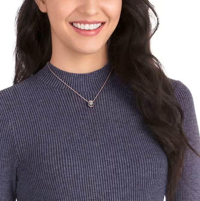 This radiant V-shape pendant has eye-catching appeal thanks to its central light blue crystal set in rhodium plating. A flourish of shimmering pavé adds an extra layer of beauty, while the delicate chain exudes pure elegance. Wear it together with the matching earrings for a wondrous combination.