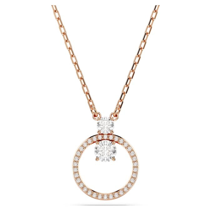 A fresh take on the classic circle pendant, this 18k rose gold plated jewellery features a central pavé ring of clear Swarovski Zirconia, with two larger prong-set Swarovski Zirconia holding it in place. A dynamic yet elegant piece, this pendant can be worn alone or paired with a matching set of Constella earrings.