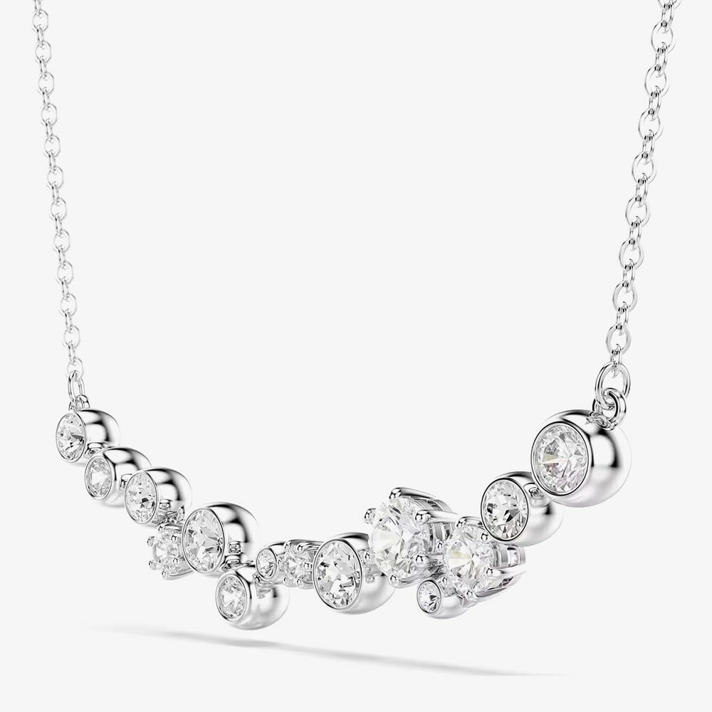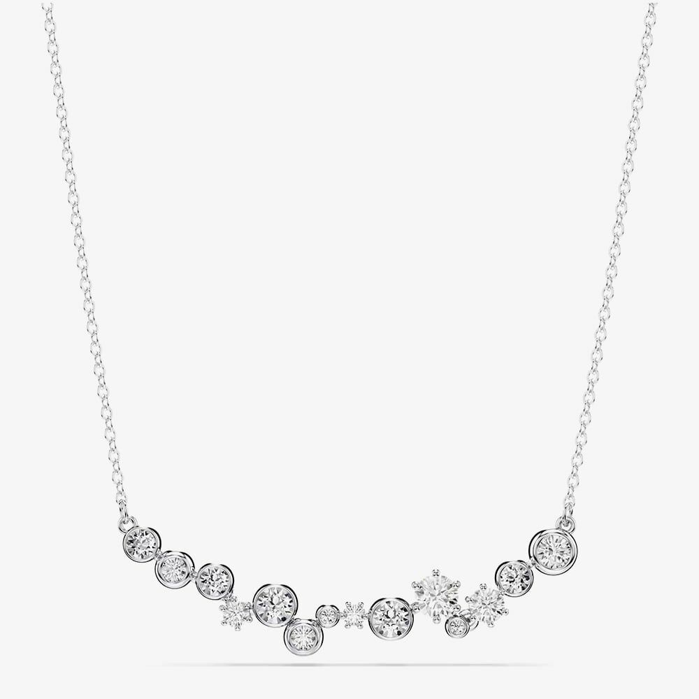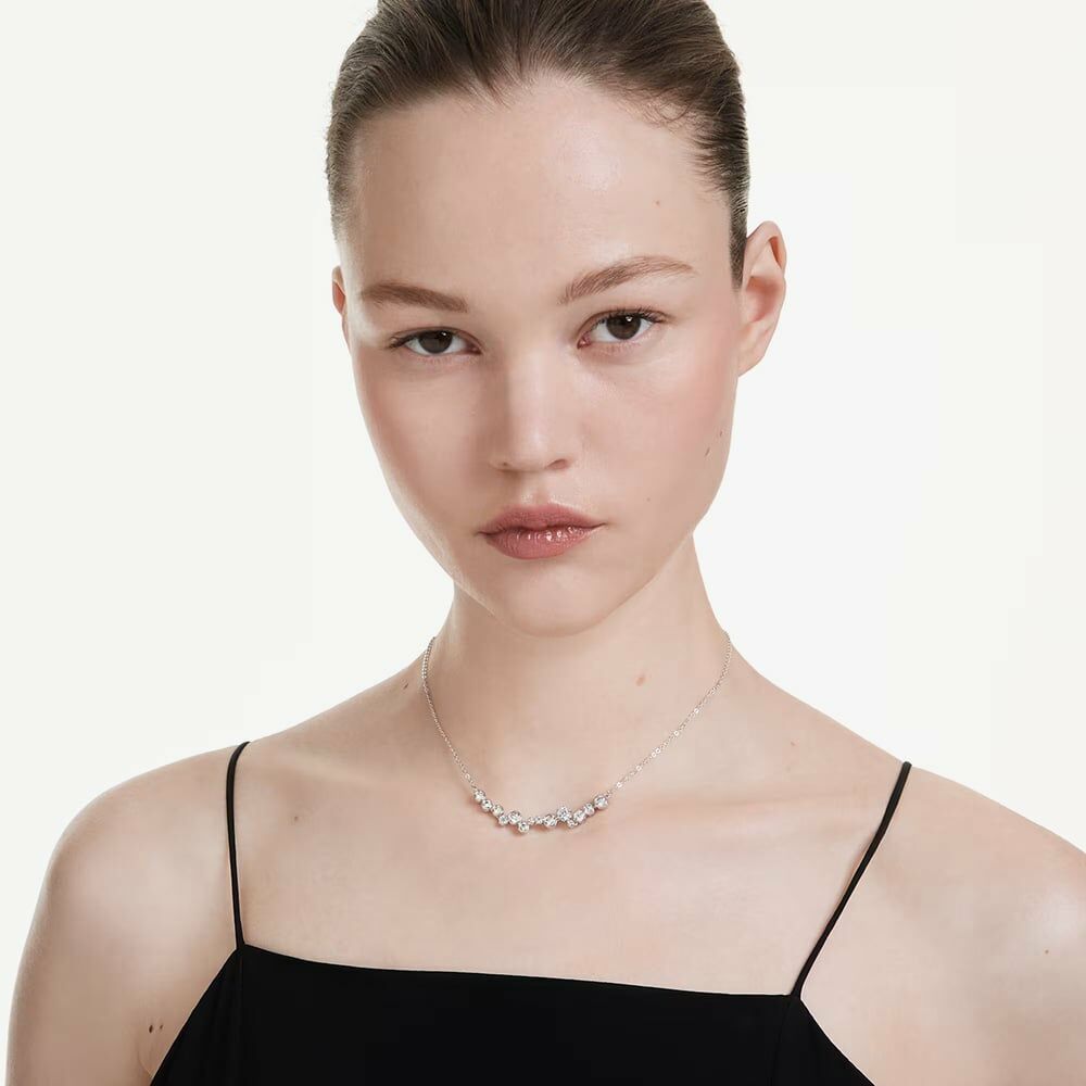 Add a burst of celestial energy to your everyday look with this dazzling Constella necklace in rhodium plating. The design features a radiant cluster of clear crystals in varying sizes, set in a mix of prong and bezel settings. Suspended on a delicate chain, it captures the magic of the stars in a beautifully refined form.