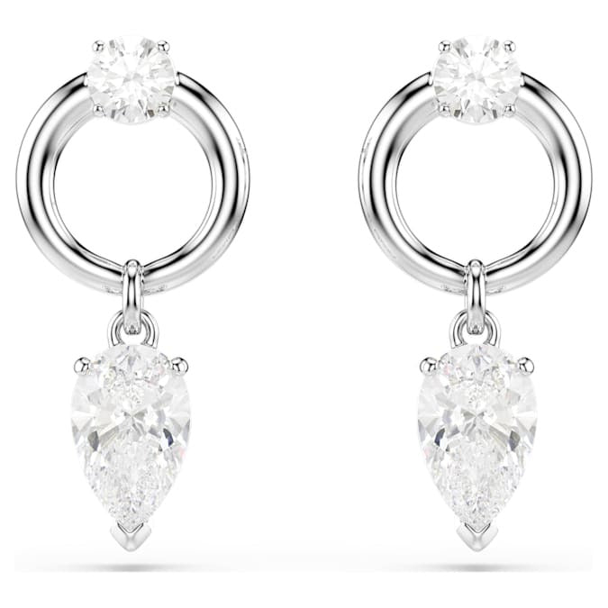 Catch the light from all angles with these unique Mesmera earrings. Each shimmering motif features a pear-cut Swarovski Zirconia, which is attached to a luxurious rhodium plated hoop. An additional round-cut Swarovski Zirconia is also placed at the centre. Wear them alongside the matching pendant to create your own stunning set.