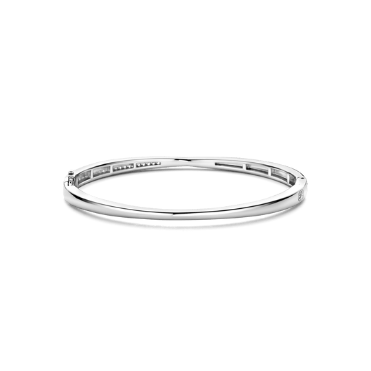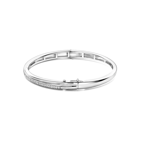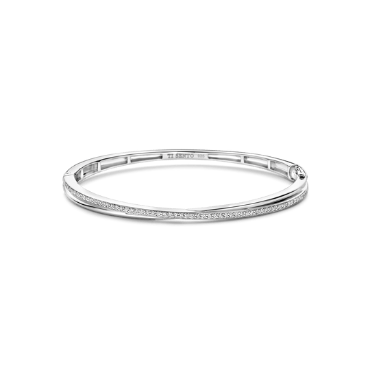 Discover a captivating blend of classic and contemporary design with this TI SENTO Silver Bangle Bracelet 23045ZI. Crafted from 925 sterling silver and plated with platinum for lasting brilliance, this bracelet features two intertwined bands. One band is adorned with a dazzling pave of white cubic zirconia stones, creating a shimmering effect. The other band is smooth and sleek, providing a striking contrast. This bracelet is a testament to the art of fine jewellery, offering a touch of modern sophistication. Its understated elegance and timeless appeal make it a versatile accessory that complements any outfit. Elevate your everyday look with this stunning piece. Wear it alone for a minimalist statement or stack it with other TI SENTO bracelets for a personalised touch. Crafted with care for sensitive skin, this nickel-free and hypoallergenic ring ensures lasting comfort and quality.