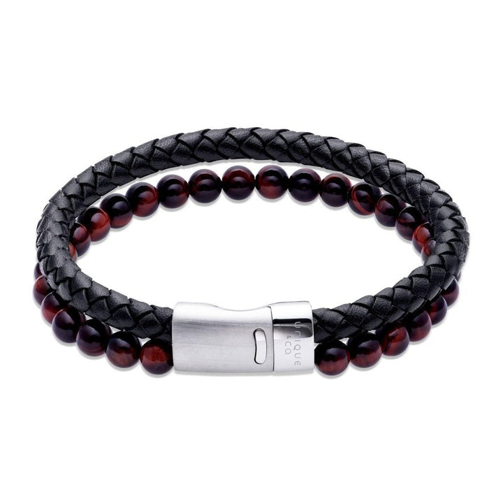 Charming red beads with a black leather bracelet and an easy-to-use brushed stainless steel magnet clasp.