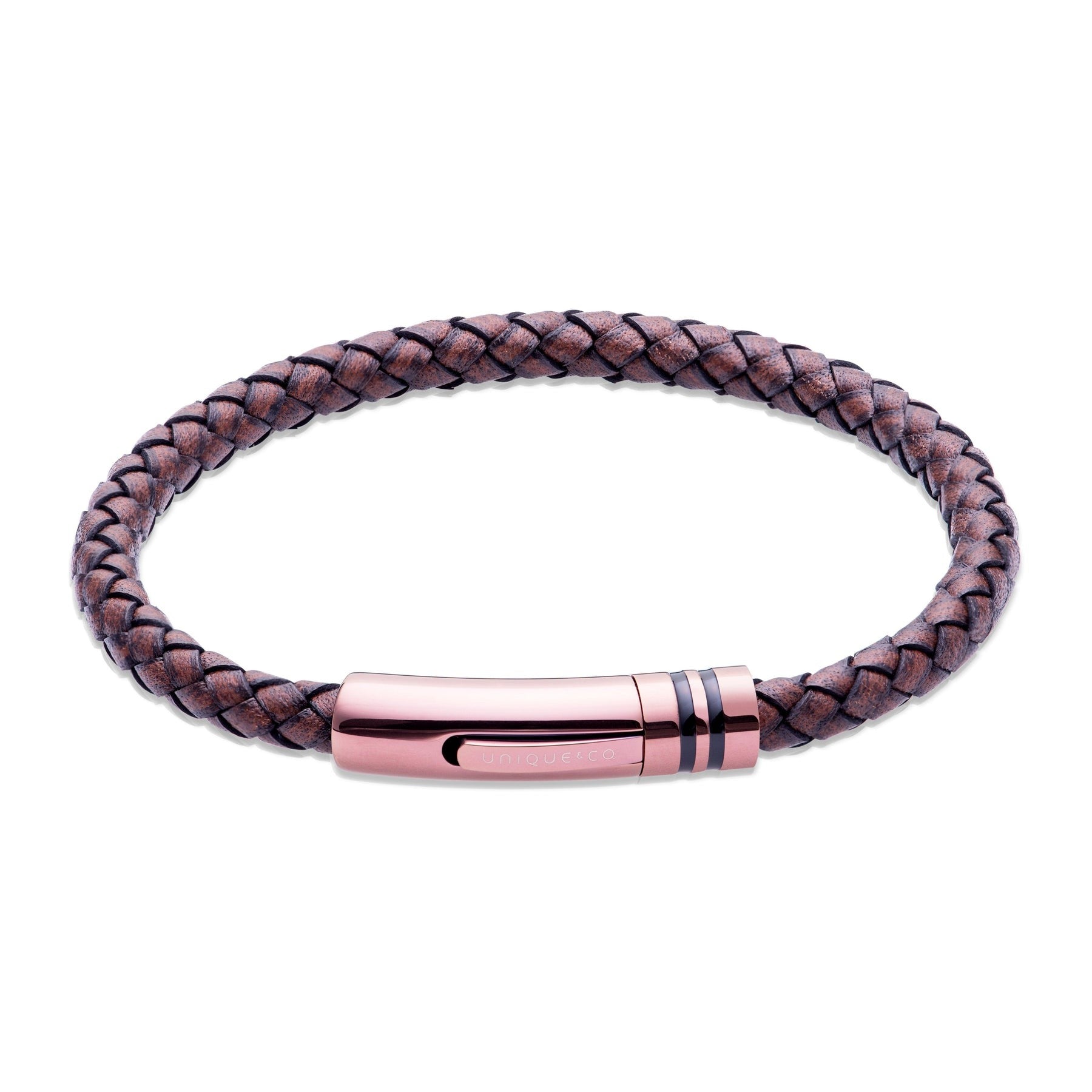 This antique brown woven leather bracelet is paired with a stainless steel and rose IP-plated clasp, designed to be durable, hard-wearing, and resistant to tarnishing.