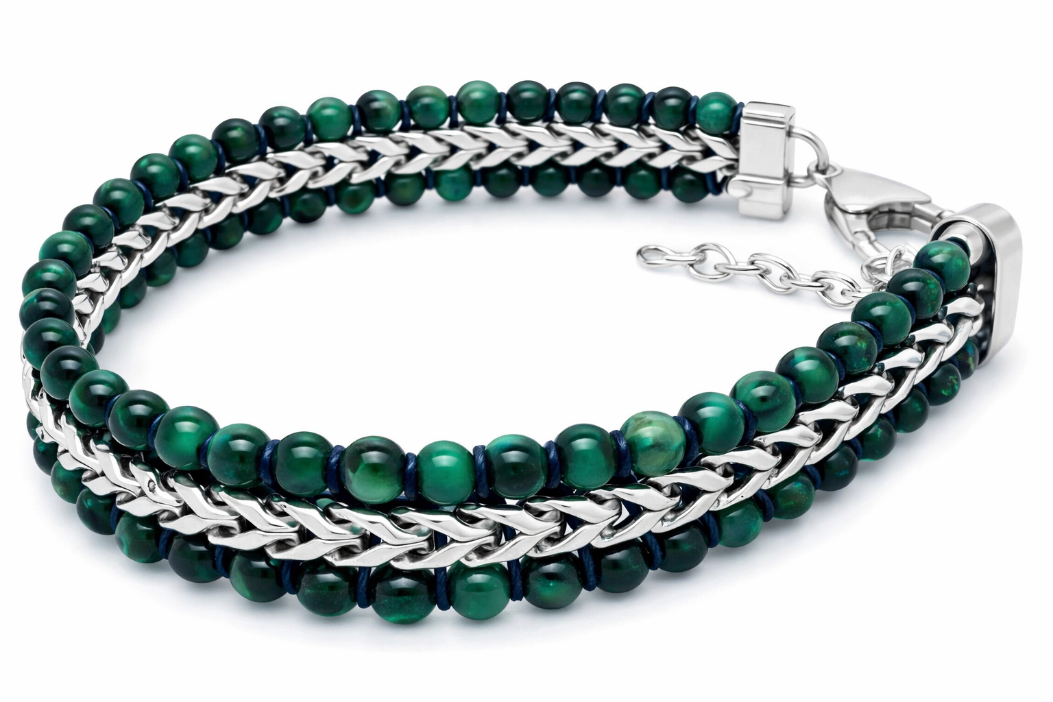 This stainless steel bracelet with Green Tigers Eye beads and an extension chain to lengthen the bracelet. Tigers Eye is thought to improve courage and self-confidence.