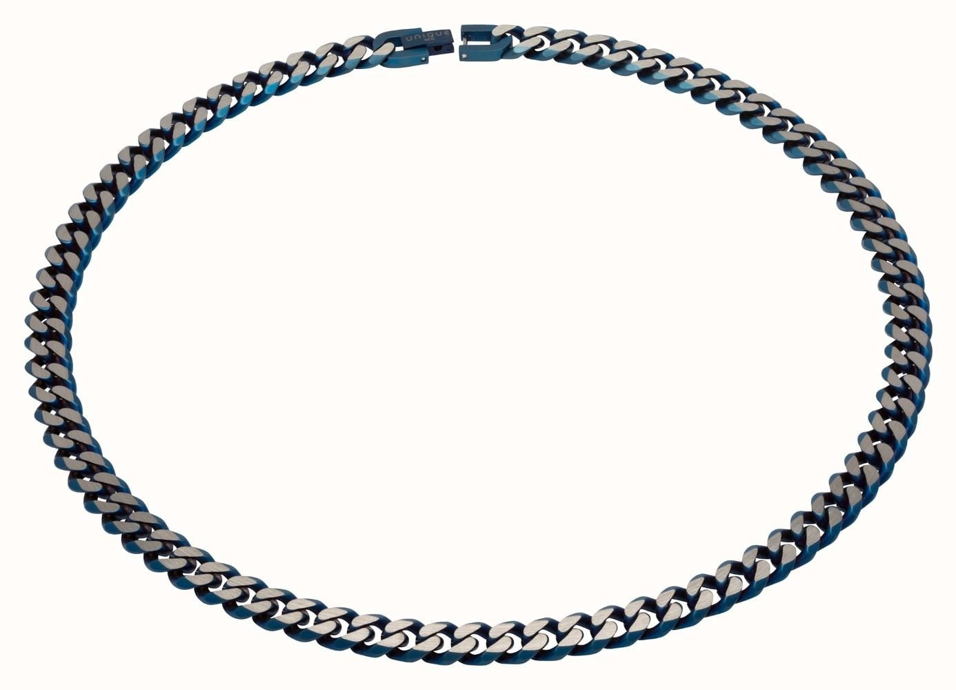 This necklace is made from matte blue ion plated stainless steel. The curb chain of the necklace is made up of a series of large links in eye-catching shades of blue and silver. This necklace measures 9mm in width and 50cm in length.