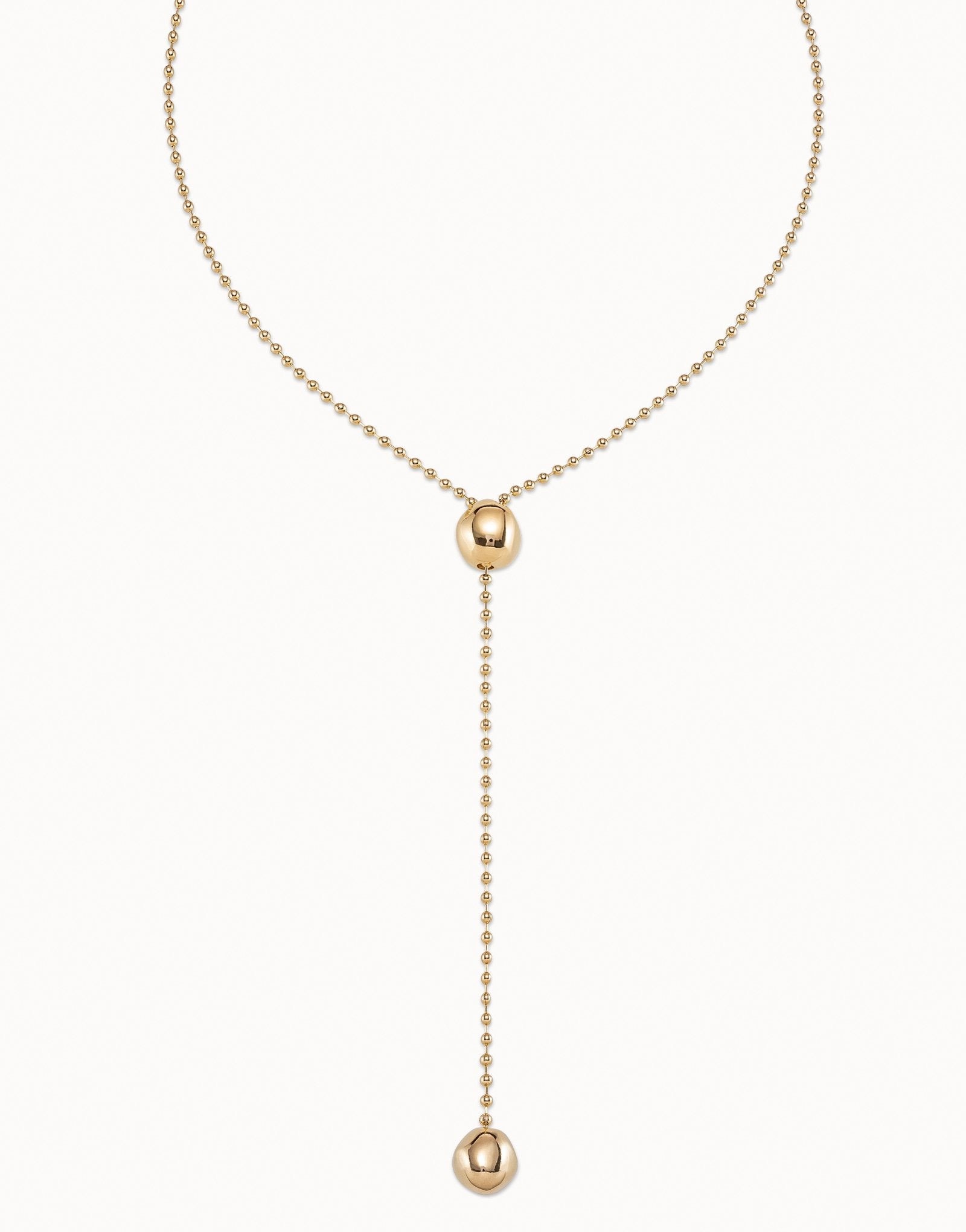 Long 18K gold-plated necklace with two opposing weights design. Handcrafted in Spain. Can be fitted to the desired size due to its adjustable clasp.