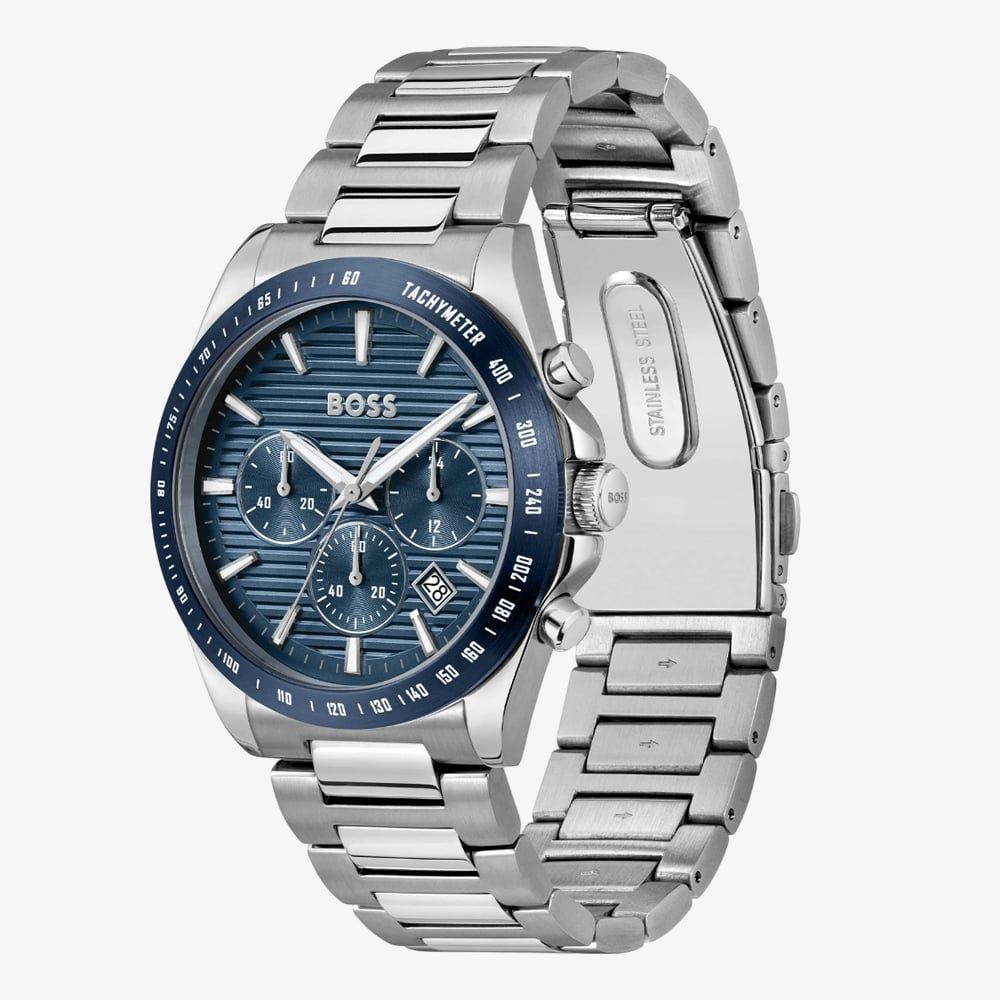 This timepiece features a stainless steel case with a sleek silver finish with a striking blue chronograph dial. The dial is accented with three subdials for precise timekeeping, luminous hands and markers for enhanced readability, and a convenient date window. A matching blue tachymeter bezel adds a touch of functionality and reinforces the watch's athletic appeal. The watch is completed by a robust stainless steel bracelet with a secure deployment clasp, ensuring both comfort and style. • Powered by the quartz movement. • Presented on a silver stainless steel bracelet with fold over clasp. • Mineral crystal glass. • 41.0mm case width. • 50 metre water resistance.