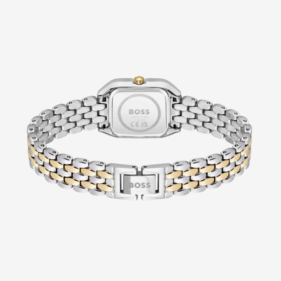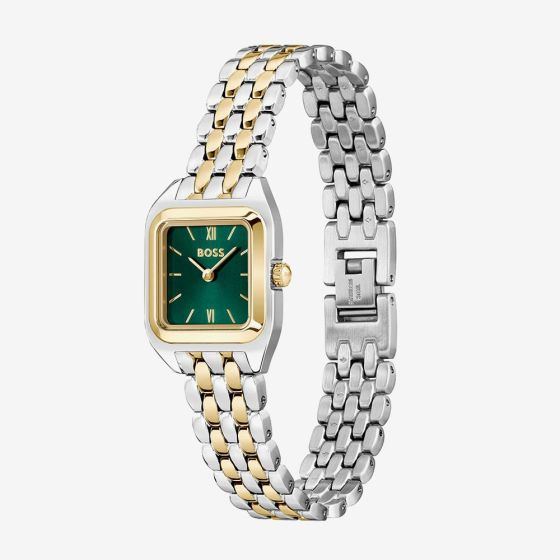The BOSS Mae Petite Two-Tone Watch features a refined rectangular case crafted from stainless steel with elegant silver and gold-tone accents. Its rich green dial adds a modern and distinctive touch, beautifully contrasted by minimalist hour markers. Paired with a slim two-tone bracelet, this timepiece offers a perfect blend of classic sophistication and contemporary flair—ideal for everyday wear with a hint of bold style.