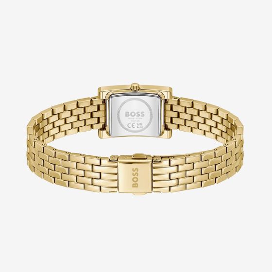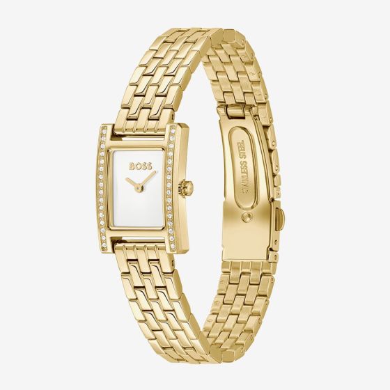 From the Lucy Precious Collection, this Hugo BOSS watch features a sleek rectangular case in a polished gold-tone finish. Sparkling crystals accent the dial and case, adding a luxurious touch to its refined silhouette. A perfect blend of elegance and contemporary style.