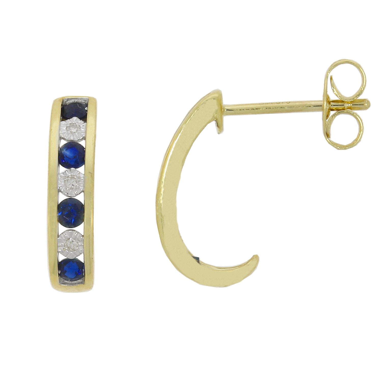 These 9ct yellow gold half hoop earrings feature channel set round brilliant cut sapphire and diamond stones, with a total diamond carat weight of 0.03ct.