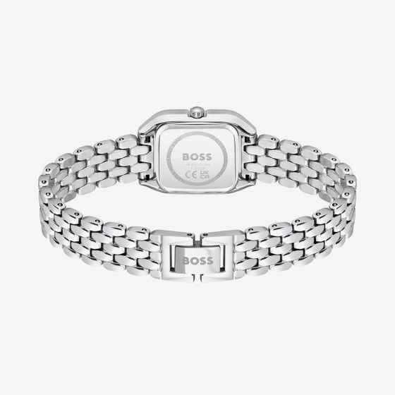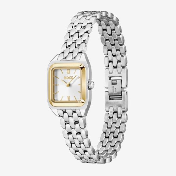 The BOSS Mae Petite Two-Tone Watch features a sleek rectangular case that exudes timeless elegance. Crafted from stainless steel with refined silver and gold-tone accents, it showcases a clean white dial with minimalist hour markers for a modern, sophisticated look. The slim two-tone bracelet adds a touch of femininity, making this watch a perfect everyday accessory with a polished finish. Ideal for those who appreciate understated luxury and classic design.