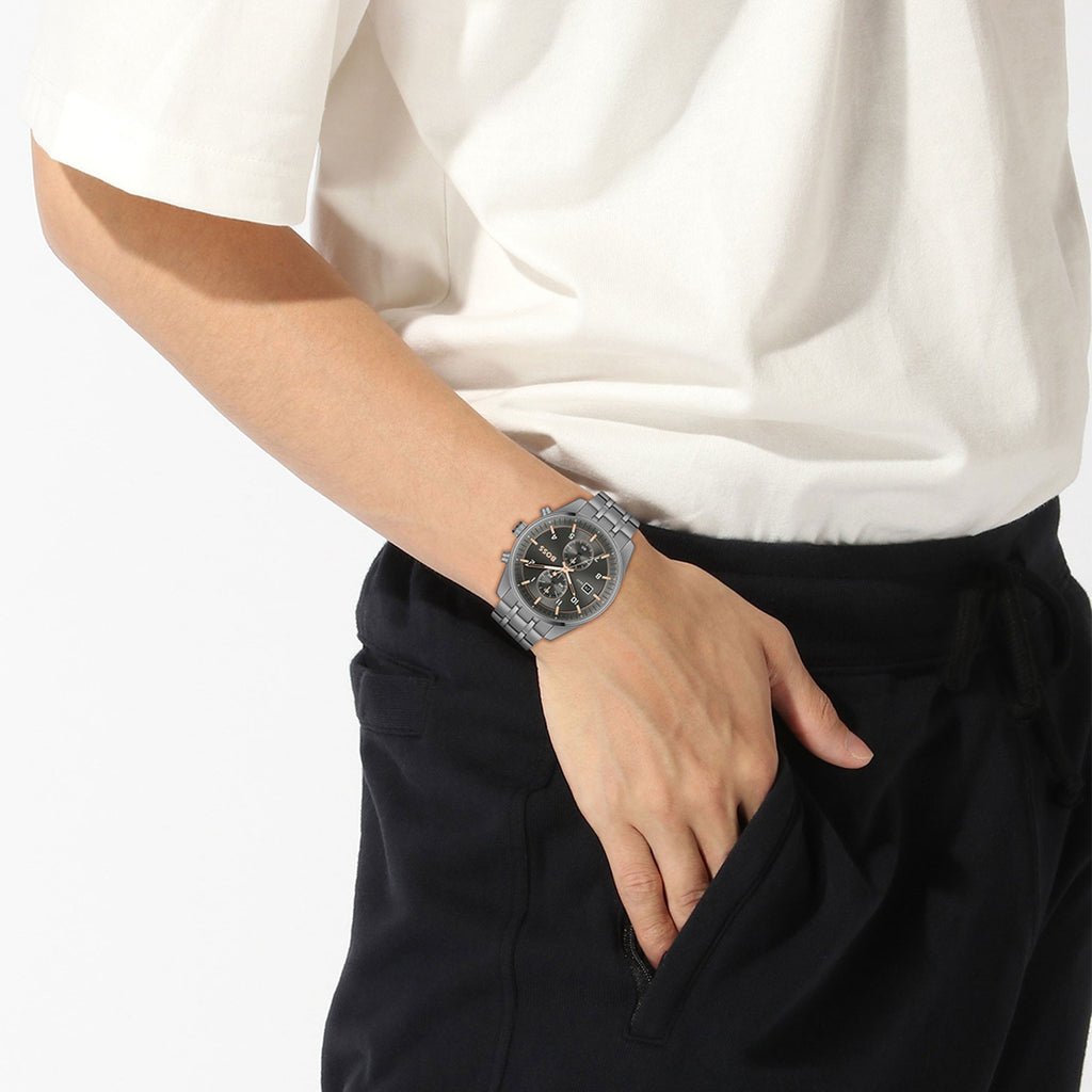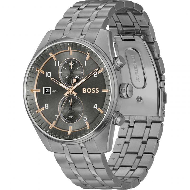 BOSS gents chronograph with date window from the Skytraveller family. Featuring a 44mm grey IP case, grey dial with grey IP bracelet. Water resistant to 5 ATM.