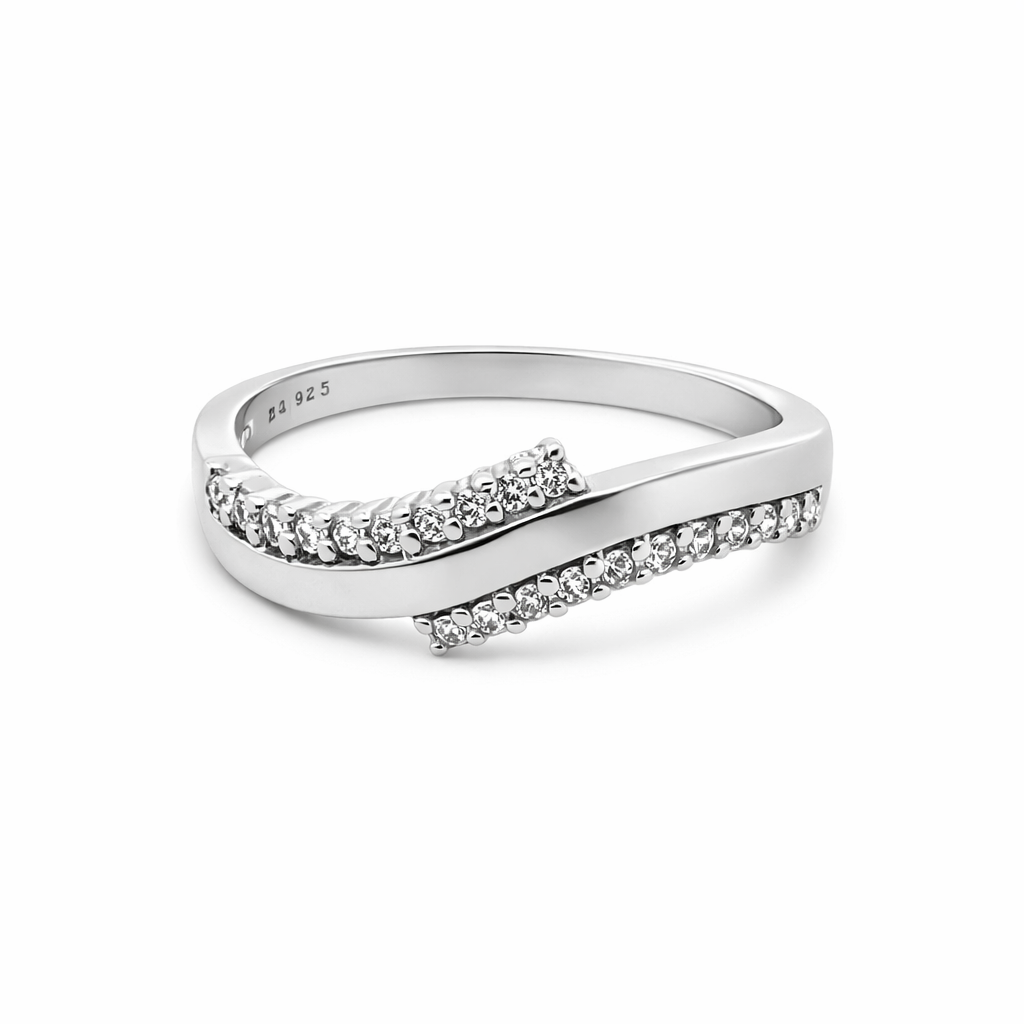 Crafted in 9ct white gold, this unique wave ring features round brilliant cut diamonds set either side of a polished band. Ring size: N.