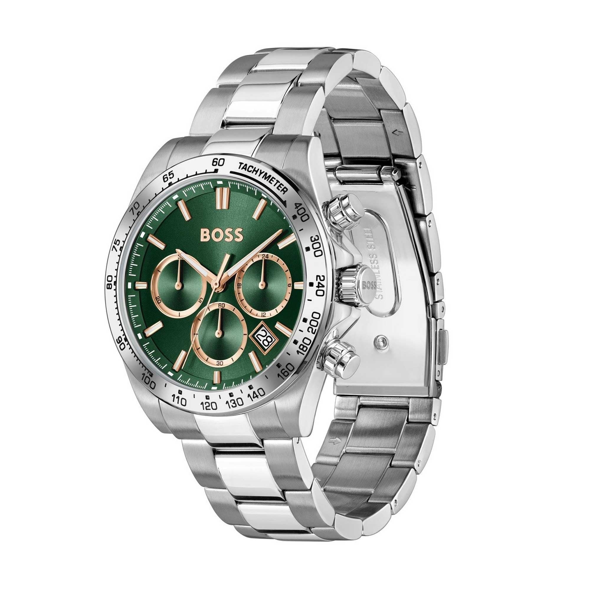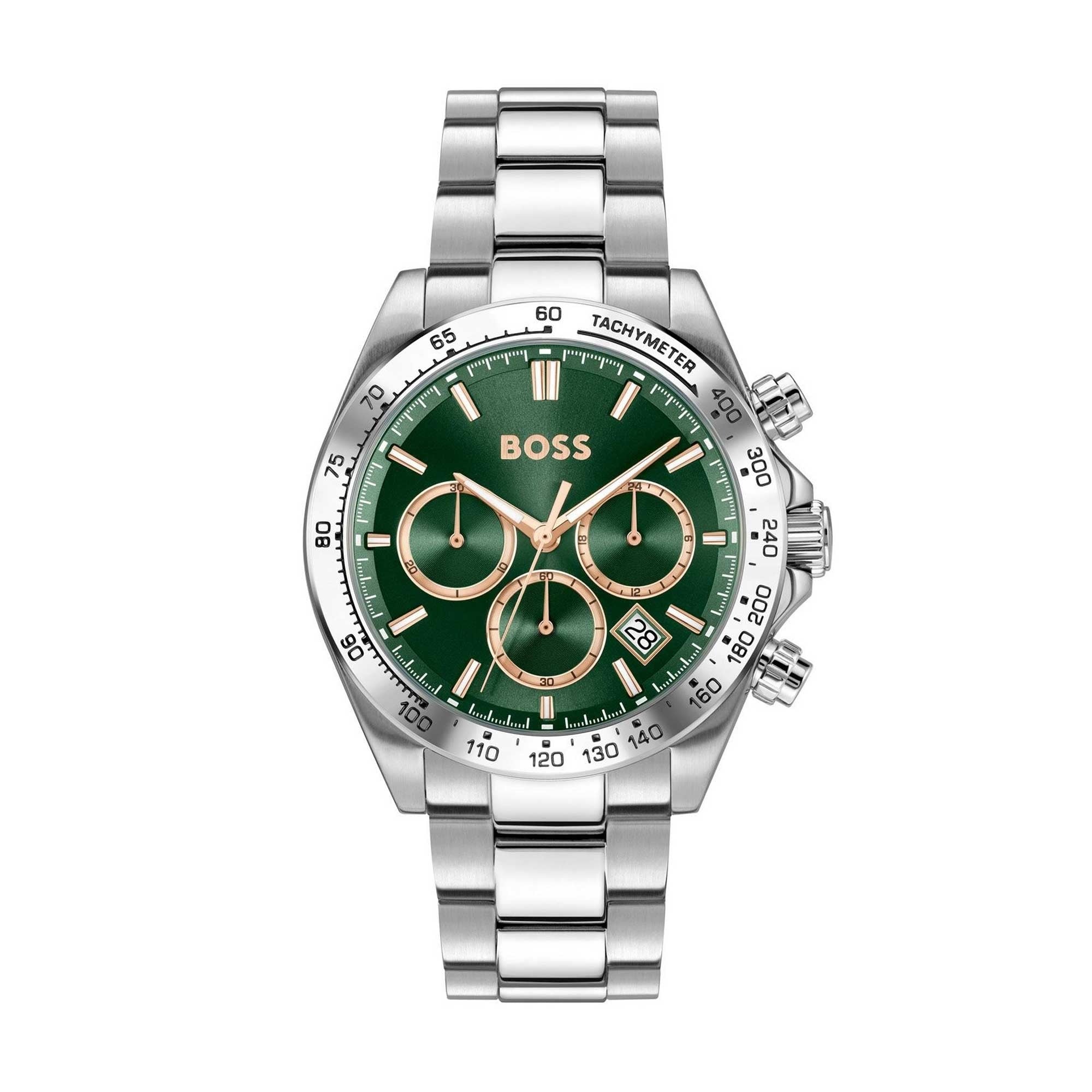 The Hugo Boss Hero 2.0 Silver Tone Black Chronograph blends refined design and functional sportiness. With its 43mm silver-tone case, bold green dial with rose gold accents and chronograph counters and tachymeter bezel, this watch makes a confident statement. Powered by quartz movement and featuring 50mm water resistance and a stainless steel bracelet, it’s a sharp choice for everyday style and precision timekeeping.