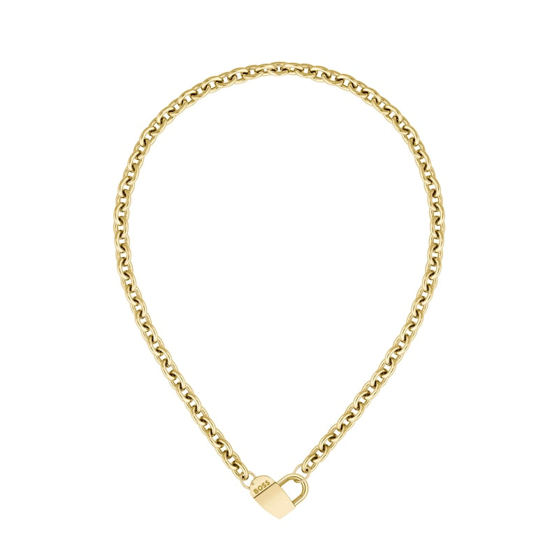The Dinya necklace blends industrial style with romantic themes. Crafted in steel, this durable necklace retains its gold sheen thanks to its gold ion-plating, whilst heart-shaped padlock design brings a streetwear-inspired feel to this designer accessory. Presented in original BOSS packaging.