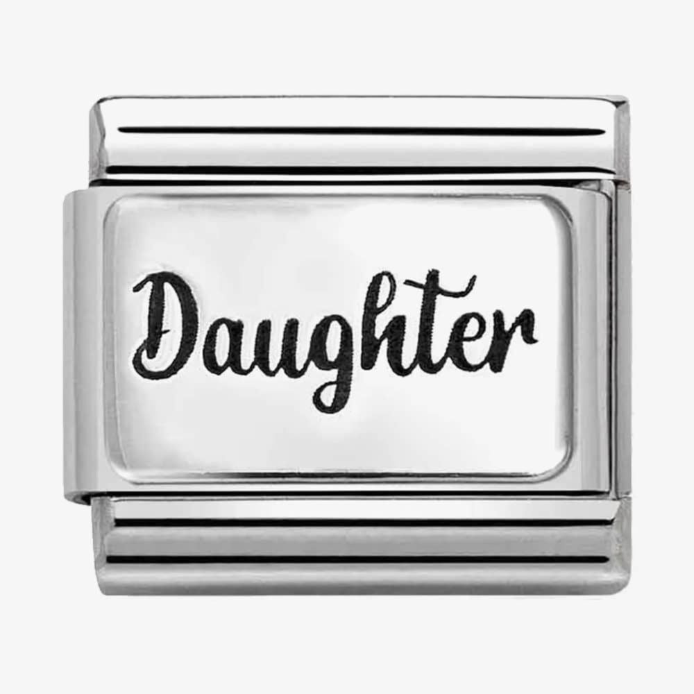 Original Nomination Classic Link in stainless steel and sterling silver with plate and black engraved DAUGHTER text. Made in Italy. Choose this Link to let your daughter know she will always be close to your heart.