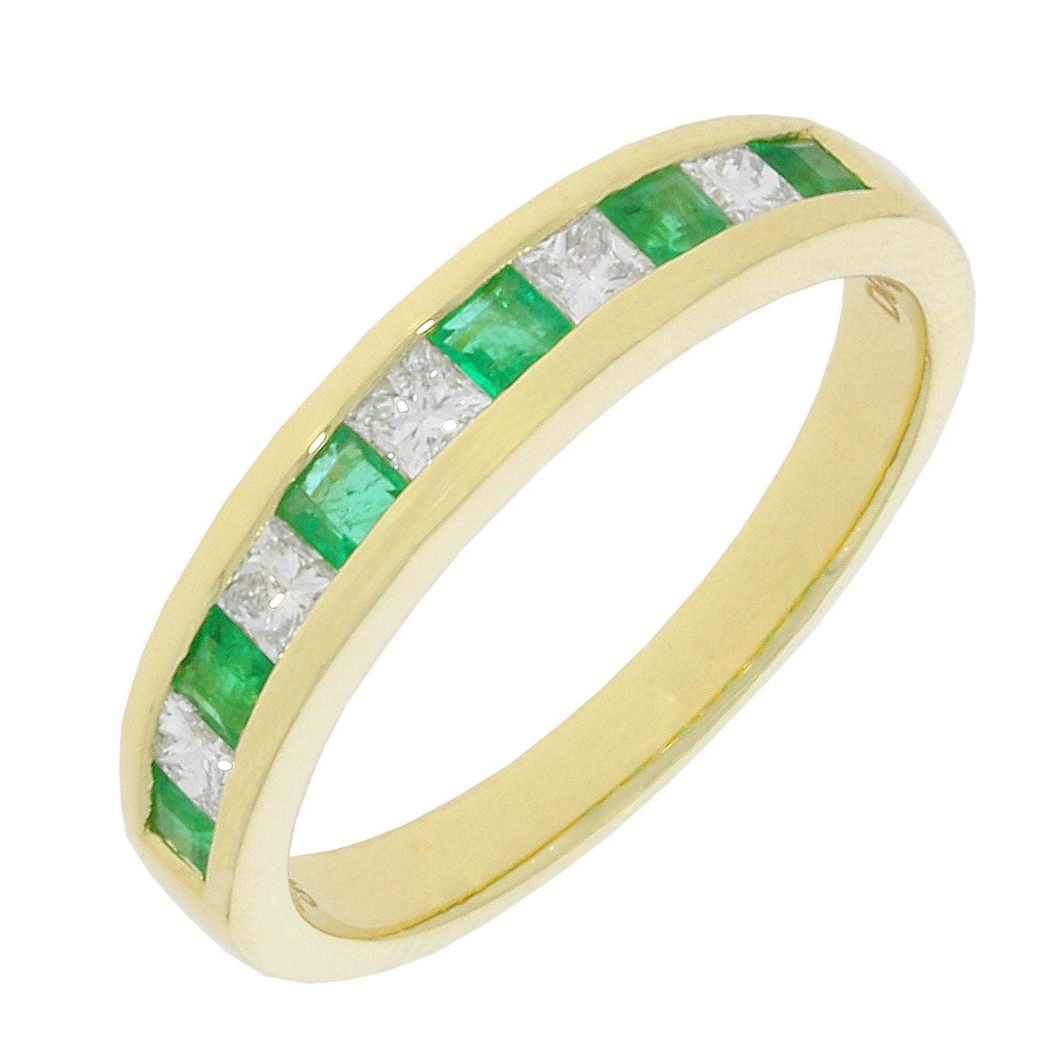 This 9ct yellow gold ring features channel set princess cut emeralds and diamonds. Ring size: N.