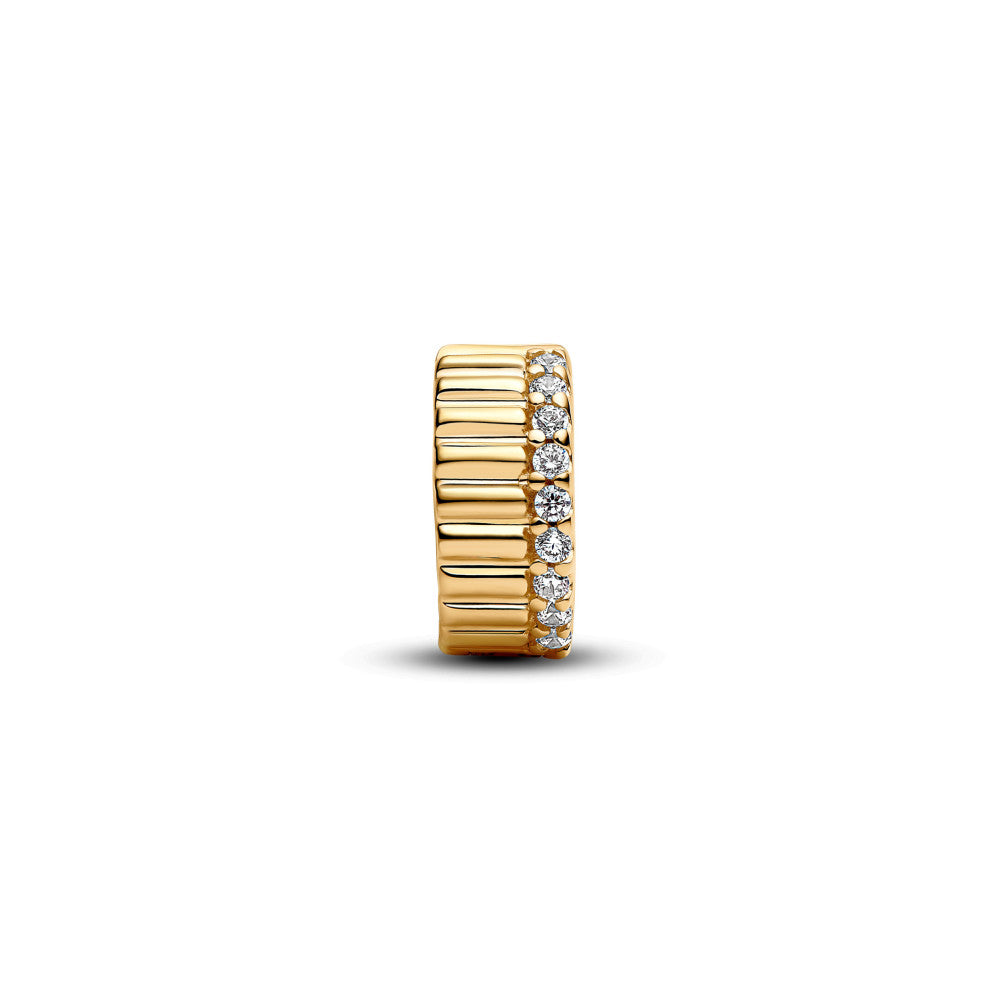 Add a touch of sparkle to your bracelet with this Pandora clip charm in 585/1000 yellow gold-plated metal. This refined piece features finely crafted grooves, enhanced with a line of carefully set sparkling stones. Its circular shape and ribbed texture give it a contemporary and sophisticated style, perfect for structuring your charm arrangements or simply for elegantly enhancing your jewellery. This clip charm is also functional, as it keeps charms in place on your bracelet while adding a touch of shine.